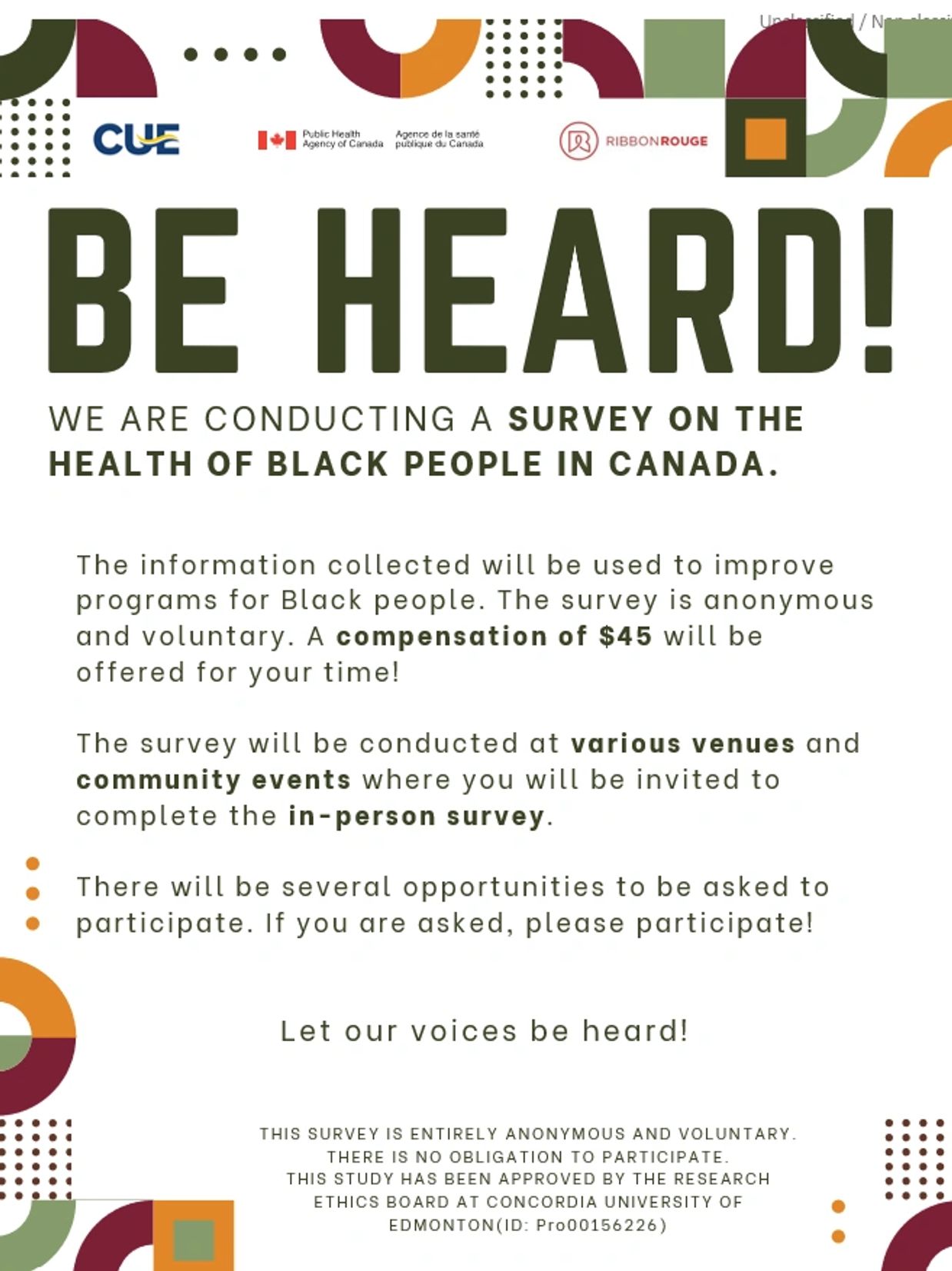 The Tracks survey among Black people in Alberta is conducted by Ribbon Rouge, in collaboration with Concordia University of Edmonton (CUE) and the Public Health Agency of Canada (PHAC). The purpose of the survey is to better understand the health of Black people, with a focus on HIV, other sexually transmitted infections (STI) and related factors. The survey is voluntary and no name or contact information will be collected. The information collected from the survey will help inform the development of programs and services to meet Black people’s needs.